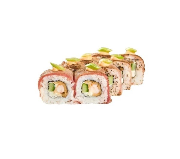 Сливочный сыр, креветка в кляре, огурец, тунец опаленный, спайси соус, лук зеленый.